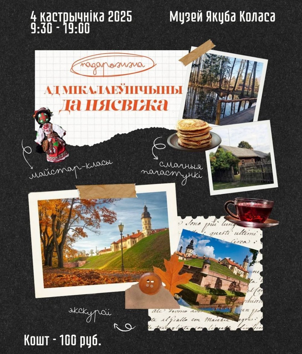 Сябры, 4 кастрычніка мы запрашаем вас у чароўнае падарожжа! Праграма падарожжа: 9:30 - ад'езд ад музея Якуба Коласа (Мінск, вул. Акадэмічная 5); 11:20 - наведванне мемарыяльнай сядзібы Акінчыцы; 12:00 - наведванне мемарыяльнай сядзібы Альбуць (экскурсійная праграма, смачны пачастунак); 13:20 - наведванне мемарыяльнай сядзібы Смольня (экскурсійная праграма, майстар-клас, смачны пачастунак); 14:20 - выезд у г. Нясвіж; 15:00 - вольны час, прагулка ў Нясвіжскім парку; 16:00 - экскурсія па Нясвіжскім замку; 17:30 - выезд у Мінск. Прыкладны час вяртання ў Мінск - 19:00. Агульны кошт паездкі – 100 рублёў (уваходзяць: праезд на камфартабельным аўтобусе, экскурсійныя праграмы на сядзібах, у Нясвіжскім замку, пуцявая інфармацыя, майстар-клас і смачны пачастунак)